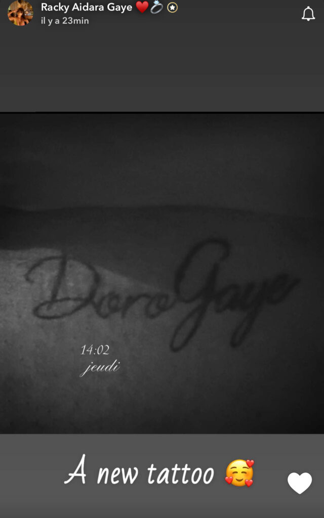 Arrêt sur image : Très amoureuse, Racky Aïdara se tatoue le nom de Doro Gaye (photo)